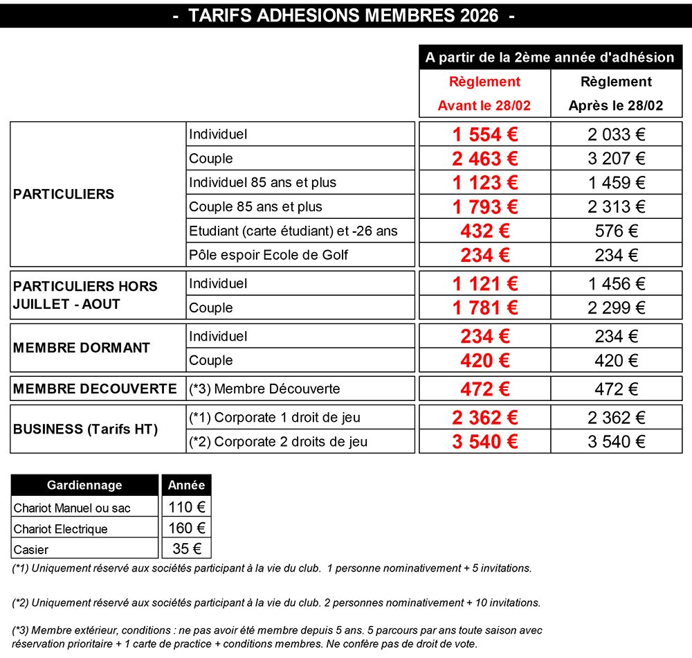L'adhésion à l'Association comprend l'appartenance à l’association et le droit de jeu sur le parcours.
